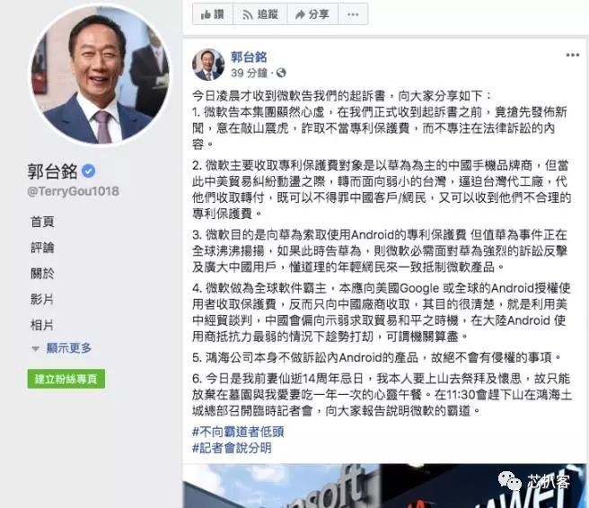 郭台铭表示,今日凌晨才收到微软状告起诉书,直言微软提告鸿海显然心虚,在鸿海正式收到起诉书之前抢先发布新闻,“意在敲山震虎,诈取不当专利保护费,而不专注在法律诉讼的内容”。
